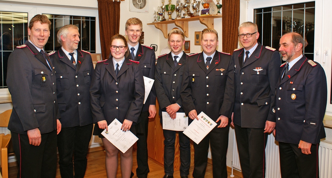 Vom Ortsbrandmeister wurden Lennart Dittmer und Sören Thömen zu Feuerwehrmännern ernannt, Laurana Fromke zur Feuerwehrfrau und Andreas Huwe zum Ersten- Hauptfeuerwehrmann.