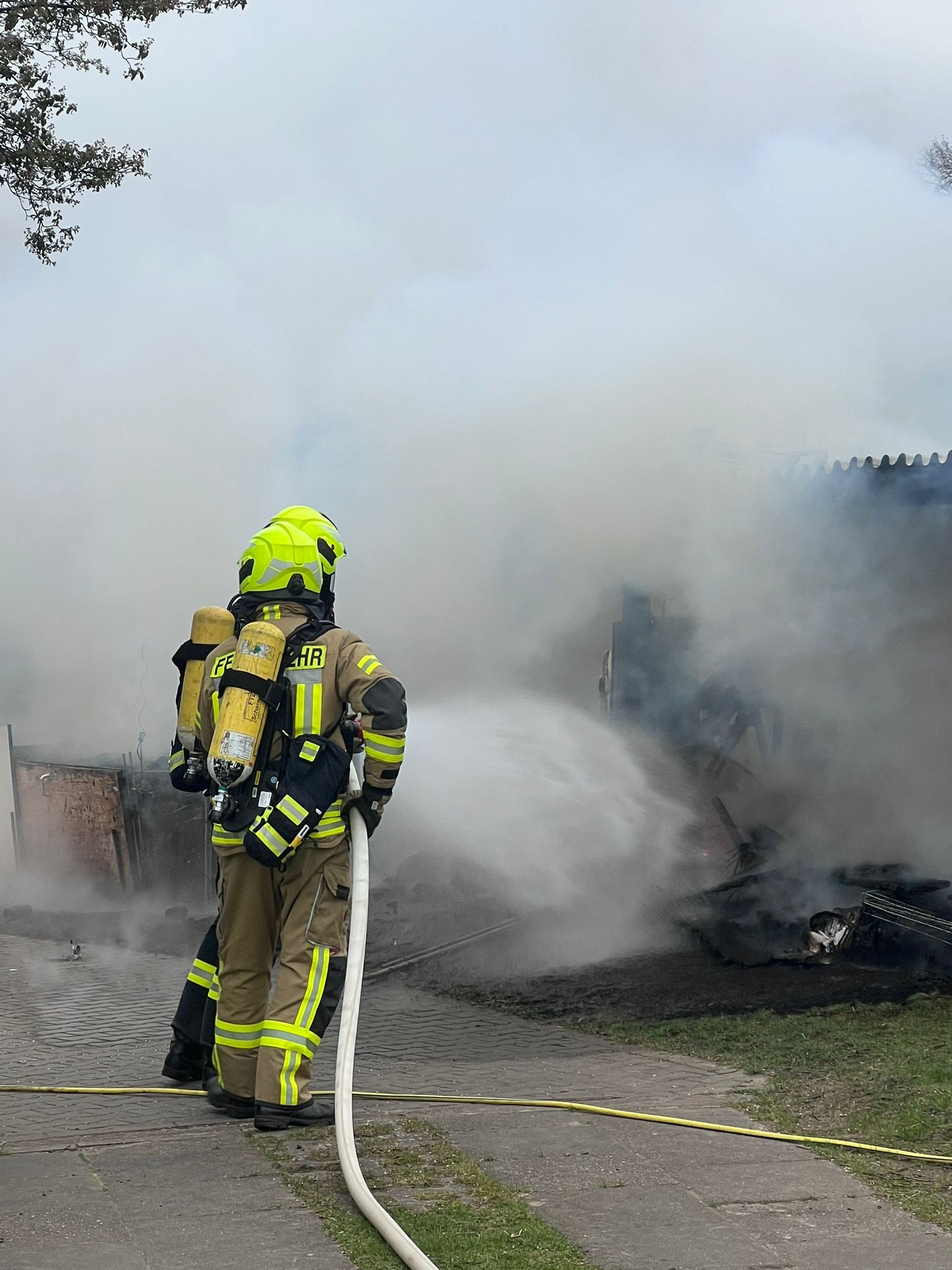 Bereits während der Anfahrt war eine deutliche Rauchentwicklung sichtbar. Beim Eintreffen an der Einsatzstelle bestätigte sich die Lage: Ein Holzunterstand sowie eine angrenzende Hecke standen in Vollbrand.